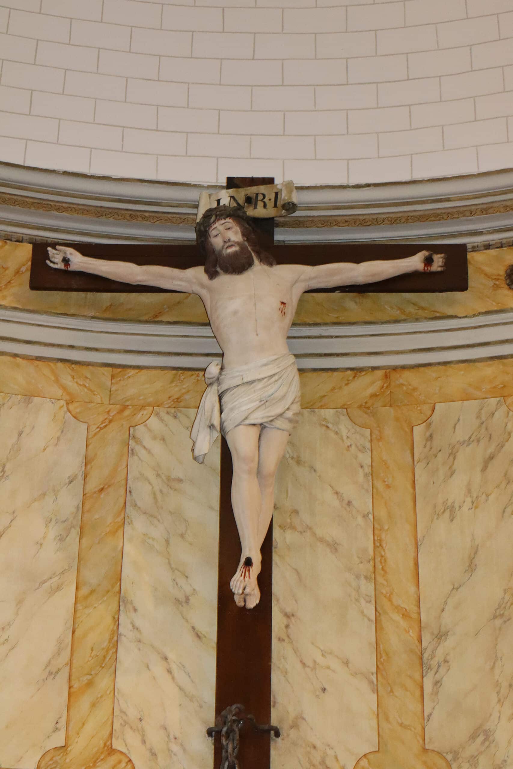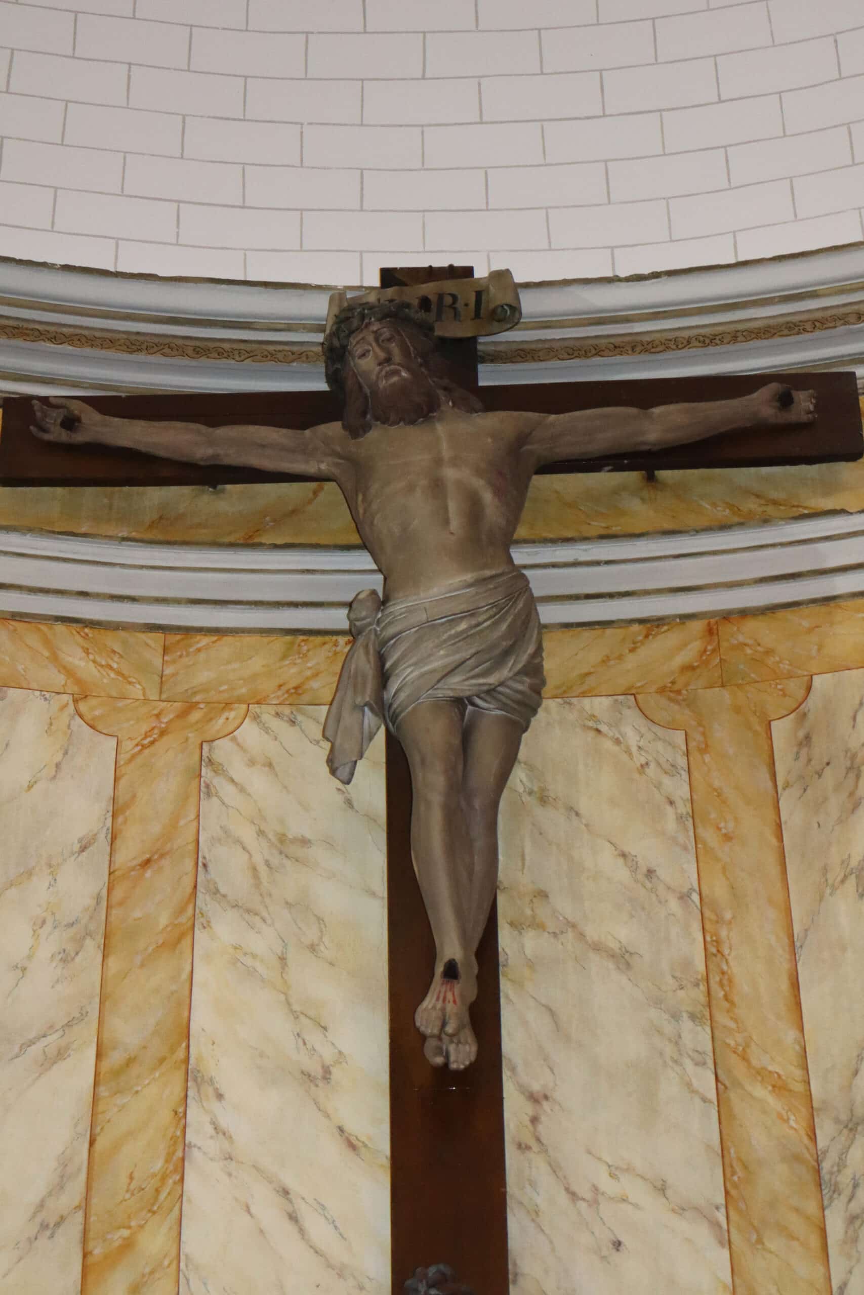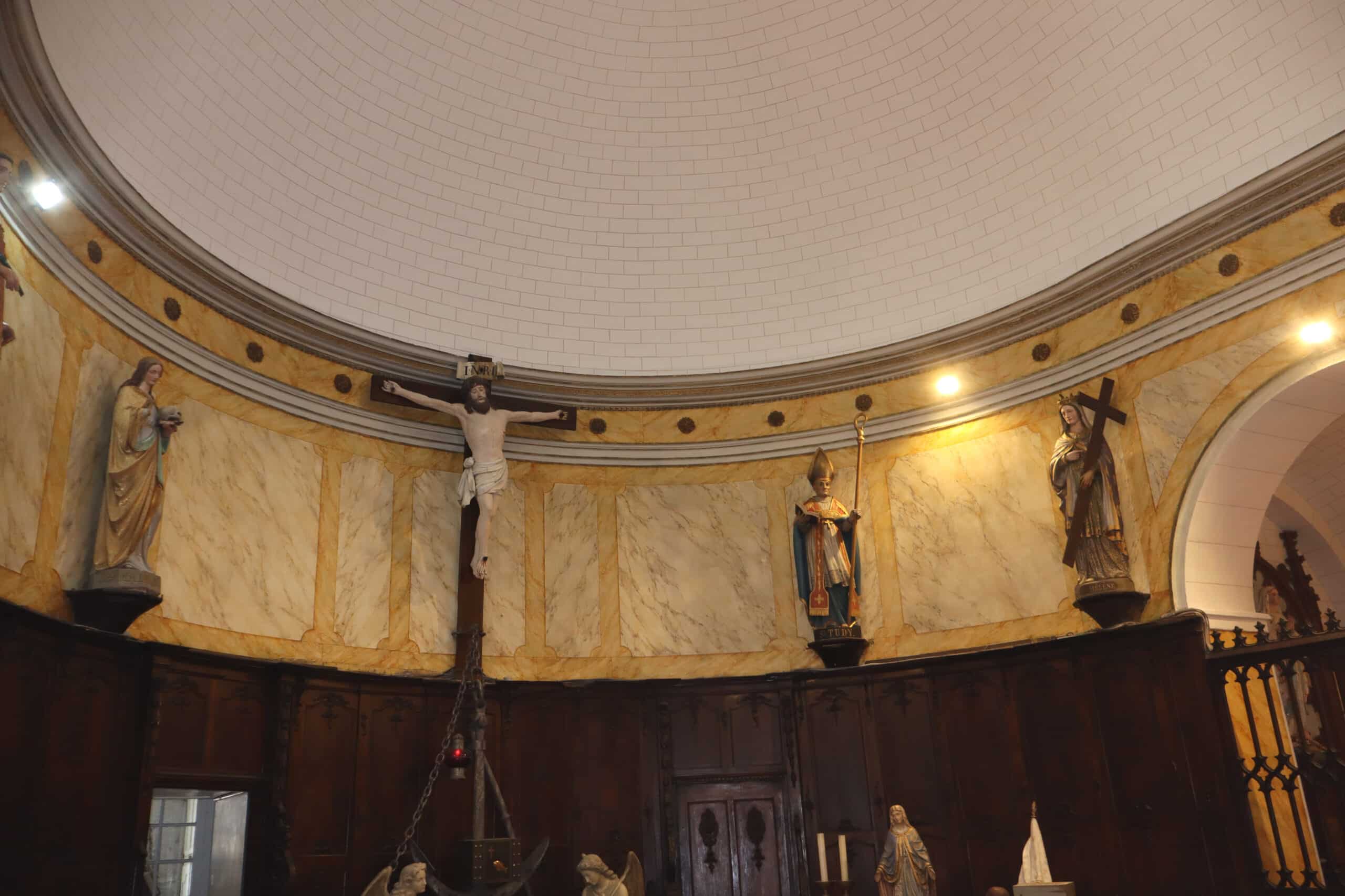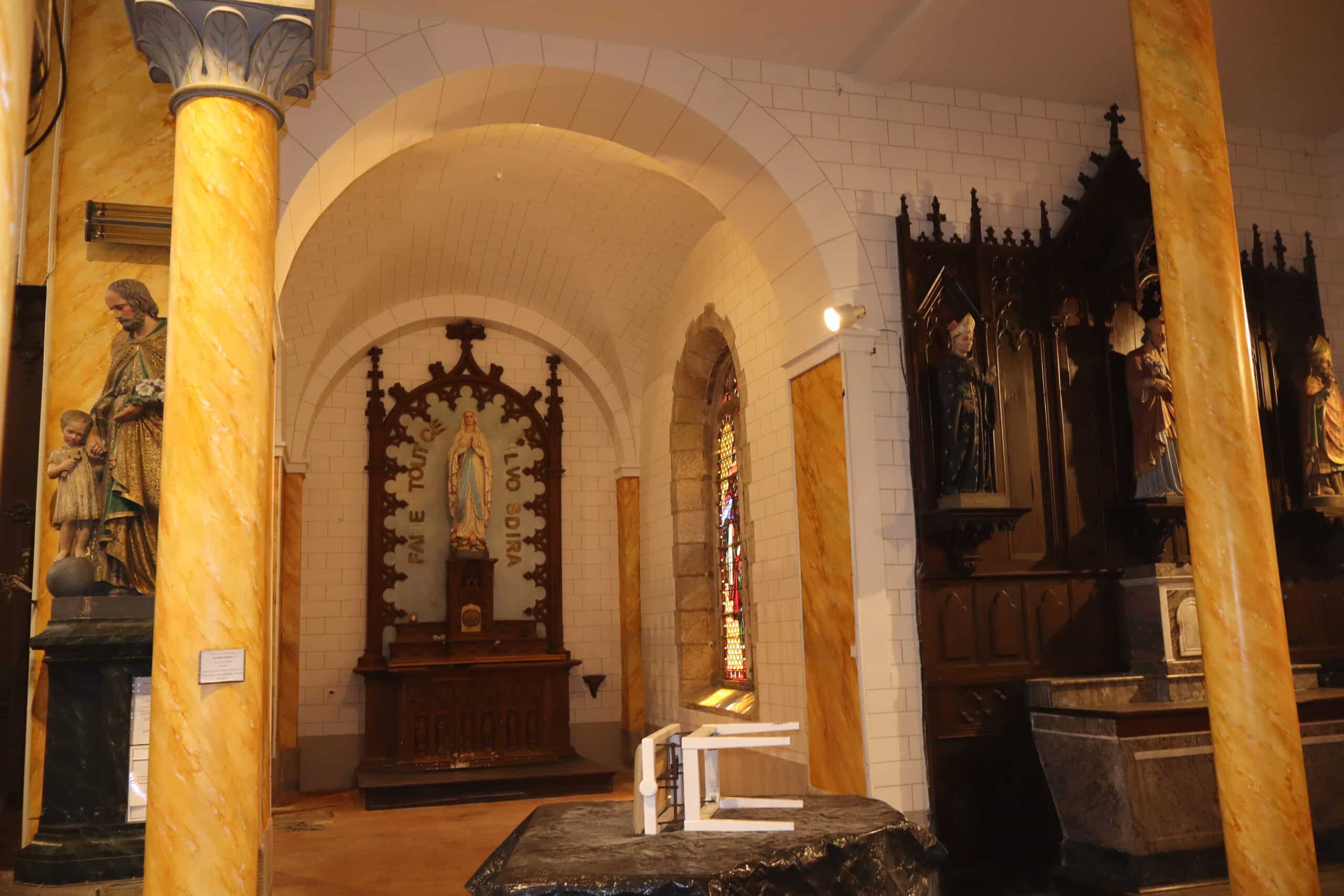 Ce chantier nous a demandé de nombreuses manutentions d’échafaudages pour l’accès aux différentes parties de l’édifice. L’utilisation d’une peinture au blanc de Meudon « Détrempe », minérale et lumineuse sur les voûtes et les murs, tout comme la restitution des décors : reliefs, faux marbre « jaune de sienne » sur les piliers et colonnes, a permis à l’édifice de retrouver sa beauté originelle. Les statues du chœur ont été nettoyées et le Christ en croix repeint.